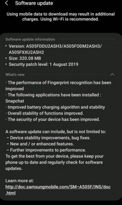ซอฟต์แวร์ใหม่นี้มีหมายเลขรุ่นว่า A505FDDU2ASH3 ขนาดไฟล์ 320MB ที่มาพร้อมกับแพทช์รักษาความปลอดภัยประจำเดือนสิงหาคมด้วย พร้อมกับข้อสังเกตว่า Samsung ได้มีการติดตั้ง Snapchat มาด้วยในการอัพเดทซอฟต์แวร์ใหม่นี้ ซึ่งเหตุการณ์แบบนี้เคยเกิดขึ้นกับ Galaxy A70 ที่มีการติดตั้ง third-party apps จากการอัพเดทซอฟต์แวร์เหมือนกัน ซึ่งทาง Samsung ได้ออกมาบอกว่าผู้ใช้งานสามารถลบแอปพลิเคชั่นเหล่านี้ได้ถ้าไม่ต้องการ