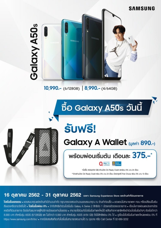 ปิดท้ายด้วยโปรโมชั่นสุดพิเศษ เมื่อซื้อกาแลคซี่ เอ 50 เอส รุ่นใดก็ได้วันนี้ รับฟรี! Galaxy A Wallet สุดเท่ มูลค่า 890 บาท และโปรผ่อนแรงแห่งปี เริ่มต้นเพียง 375 บาทต่อเดือน เมื่อซื้อ กาแลคซี่ เอ 50 เอส รุ่น 4/64 GB ผ่านบัตร Citi Ready Credit และผ่อน 0% นาน 24 เดือน หรือผ่อน 0% นาน 10 เดือนเมื่อชำระผ่านบัตรกรุงศรี First Choice ตั้งแต่วันที่ 16 – 31 ตุลาคม 2562 ที่ ซัมซุง เอ็กซ์พีเรียนซ์ สโตร์ และร้านค้าที่ร่วมรายการ สามารถติดตามเงื่อนไขโปรโมชั่นเพิ่มเติมได้ที่เว็ปไซต์ https://www.samsung.com/th/tnc/
