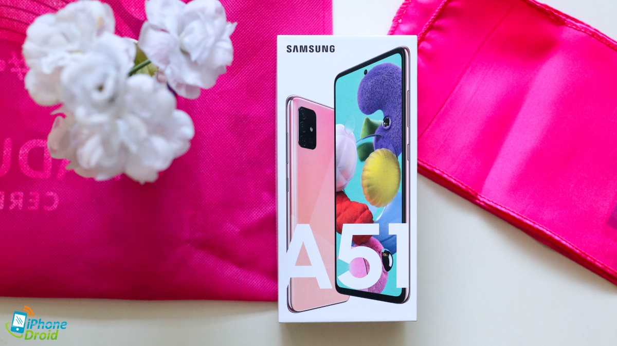 ตัวกล่องของ Samsung Galaxy A51 มาในรูปแบบสี่เหลี่ยมตามปกติของตระกูลนี้โดยมีรูปและชื่อรุ่นอย่างชัดเจนที่ด้านหน้า