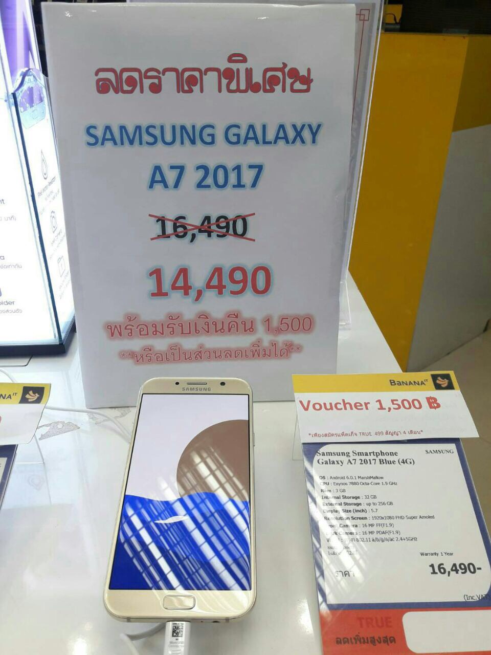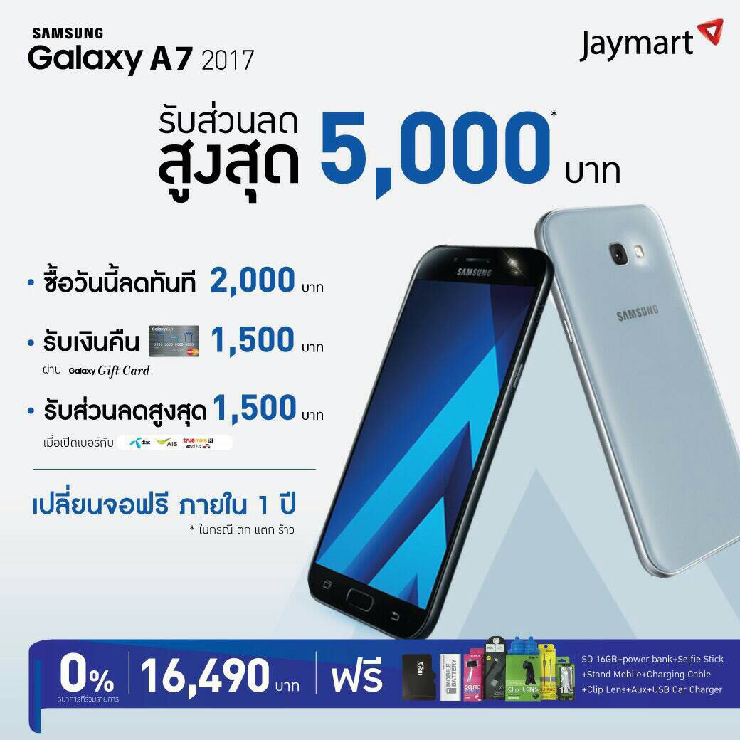 โปรโมชั่นจัดหนักจัดเต็มทุกร้านทั่วไทยสำหรับ Samsung Galaxy A7 (2017) ซื้อวันนี้ลดทันที 2,000 บาท และให้เงินคืนอีก 1,500 บาท แถมรับประกันจอแตกเปลี่ยนฟรีให้ 1 ครั้งภายใน 1 ปี