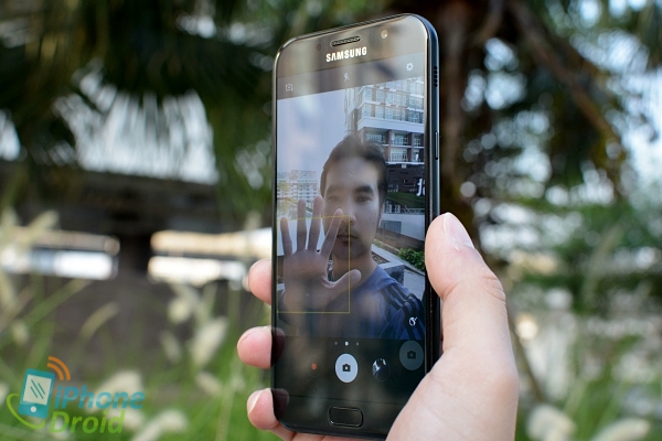บริเวณเหนือหน้าจอ Galaxy A7 (2017) จะมีเลนส์กล้องหน้าความละเอียด 16 ล้านพิกเซล ค่ารูรับแสง f/1.9 ช่วยให้ถ่ายภาพได้สว่างมากขึ้น