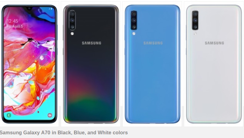 Samsung Galaxy A70 ได้เปิดตัวแล้วในประเทศอินเดีย โดยให้สามารถสั่งจองได้แล้วในระหว่างวันที่ 20 เมษายน จนถึง 30 เมษายนนี้และพร้อมที่จะจัดส่งในวันที่ 1 พฤษภาคมนี้
