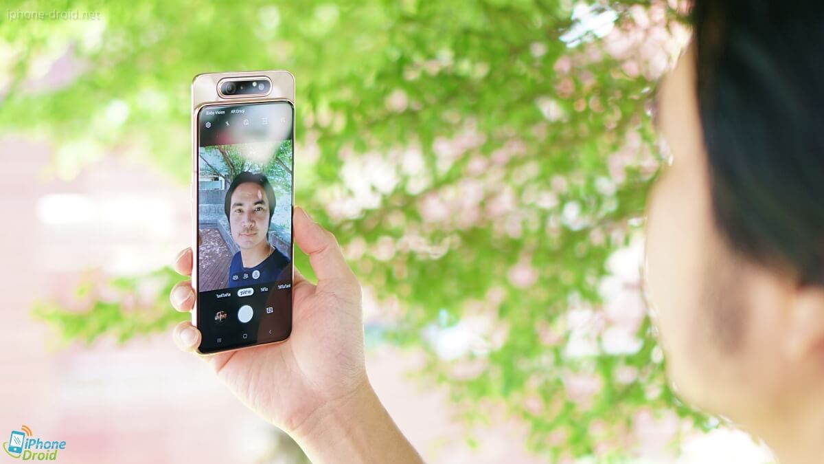 Samsung Galaxy A80 สมาร์ทโฟนรุ่นแรกที่มีกล้องหลัง 3 ตัวแล้วหมุนมาด้านหน้าเพื่อใช้เป็นกล้องหน้าได้ ทำให้การเซลฟี่มีฟีเจอร์ที่ทำงานได้เหมือนกล้องหลัง และไม่ต้องมีรอยบากบนหน้าจอด้วย