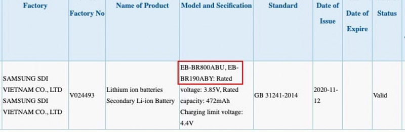 Galaxy Buds Beyond ระบุว่าจะมาพร้อมแบตเตอรี่ความจุ 472mAh เท่ากับ Galaxy Buds Live โดยโมเดลของ Buds Beyond ที่ผ่านรับรองจะมี 2 รุ่น ได้แก่ EB-BR170ABU และ EB-BR190ABY