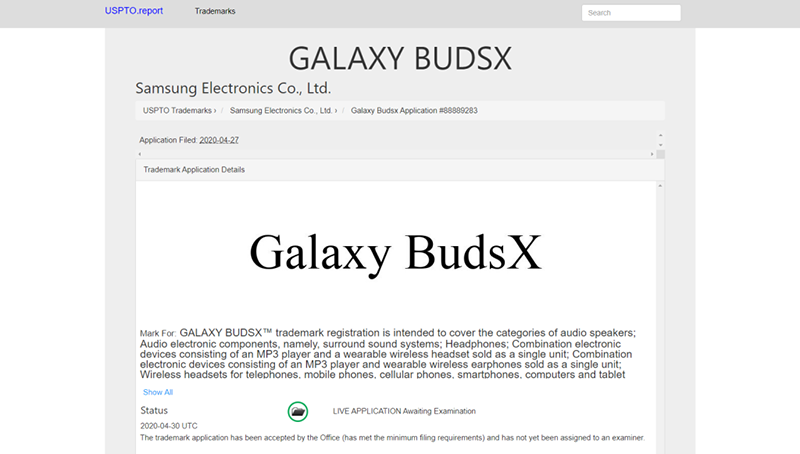 สิทธิบัตรดังกล่าวเผยออกมาจาก USPTO หรือสำนักงานทรัพย์สินทางปัญญาสหรัฐ ซึ่งเป็นการยืนยันชื่อ Galaxy BudsX ว่าจะเป็นรุ่นที่เปิดตัวในเร็วๆ นี้ ทั้งนี้ ในเอกสารยังระบุว่าหูฟังรุ่นนี้จะมาพร้อมกับเครื่องเล่นเพลง MP3 ในตัว หมายความว่า Galaxy BudsX อาจมีความจุภายในเพื่อเก็บเพลง โดยไม่ต้องใช้สมาร์ทโฟนในการเล่นเพลงแล้ว