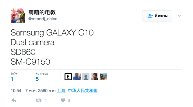 ตามรายงานแหล่งข่าวจากจีนบอกว่า Galaxy C รุ่นใหม่หรือตามรายงานเรียกว่า Galaxy C10 รุ่นโมเดล SM-C9150 จะเป็นสมาร์ทโฟนรุ่นแรกที่มีกล้องหลังเลนส์คู่จาก Samsung และมาพร้อมชิปเซ็ต Snapdragon 660 SoC ตัวใหม่ที่มีกำหนดการเปิดตัวจาก Qualcomm ในวันที่ 9 พฤษภาคมนี้
