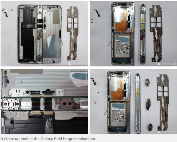 จากการแกะ Samsung Galaxy Fold ทำให้เรารู้ว่าภายในสมาร์ทโฟนรุ่นนี้จะแบ่งออกเป็น 5 ส่วนด้วยกัน ส่วนที่ใหญ่และสำคัญที่สุดก็คือส่วนของหน้าจอแสดงผลที่สามารถพับเก็บได้  และส่วนต่อมาก็คือที่เป็นกลไกในการพับงอ ซึ่งในส่วนนี้มีการพัฒนาและออกแบบหลายครั้งกว่าจะสำเร็จเป็นเหมือนกับที่เราเห็นในสมาร์ทโฟนรุ่นนี้