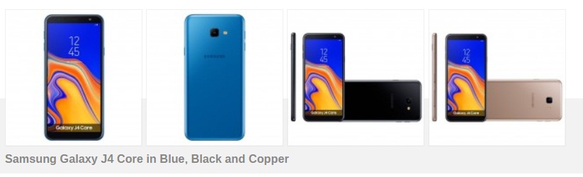 Samsung Galaxy J4 Core จะมีให้เลือกทั้งแบบสีน้ำเงิน สีดำและสีทองแดง แต่ยังไม่มีราคาหรือวันจัดส่ง จะมีการเปิดตัวด้วยระบบปฏิบัติการ Android 8.1 Oreo (Go Edition)