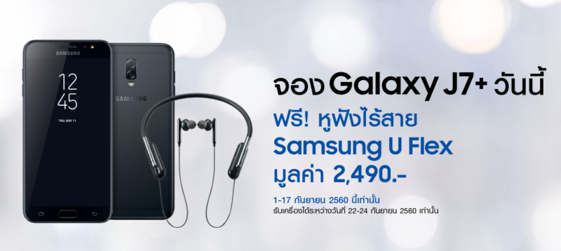 Galaxy J7+ มาพร้อมโปรโมชั่นสุดคุ้ม แถมฟรีหูฟัง Samsung U Flex มูลค่า 2,490 บาท พิเศษ!!! สำหรับลูกค้าที่จองสินค้าผ่าน Samsung Brand Shop จะได้รับ Soft Cover สี Clear มูลค่า 390 บาท