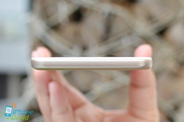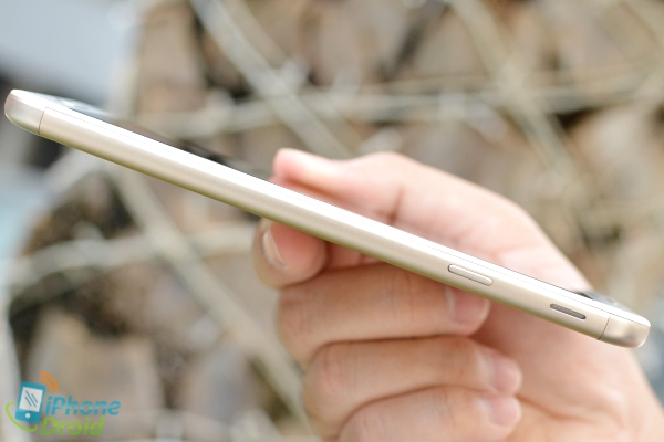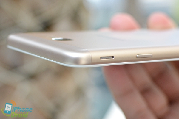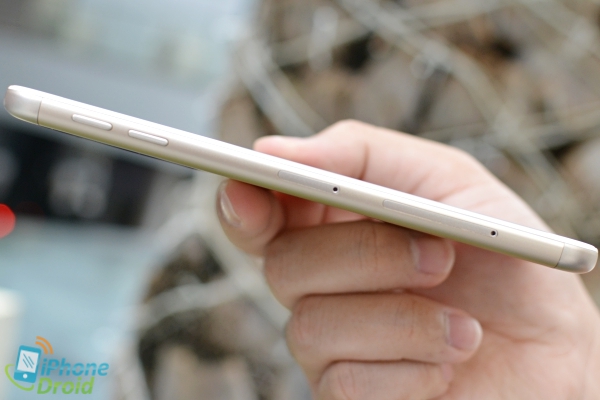 ขอบด้านข้างซ้ายมีปุ่มปรับระดับเสียง, ถาดใส่ซิมซึ่งรองรับ 2 ซิมขนาด Nano SIM และช่องใส่ microSD card