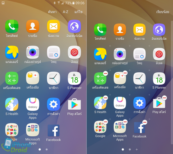 App Drawer จะเรียงแบบ 5 x 5 แถว ปัดซ้ายขวาเพื่อเลื่อนหน้าถัดไป และเมื่อแตะที่เมนูแก้ไขที่อยู่ตรงมุมขวาบนจะสามารถลบหรือถอนการติดตั้งแอพพลิเคชั่นระบบได้ ซึ่งช่วยให้ผู้ใช้งานสามารถลบแอพพลิเคชั่นที่ไม่ต้องการและไม่ได้ใช้งานออกจากเครื่องได้โดยไม่ต้องรูทเครื่อง