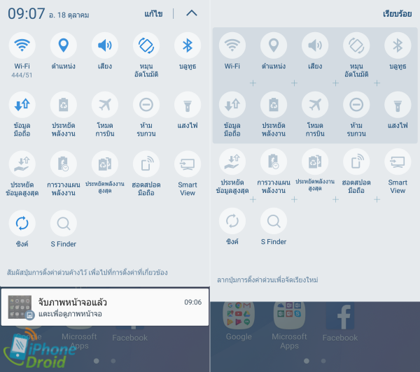 เมื่อลากแถบด้านบนลงมาจะเป็นในส่วนของการแจ้งเตือนต่าง ๆ และ Quick Settings สำหรับปิด/เปิดการทำงานระบบและเข้าสู่การตั้งค่าต่าง ๆ ของระบบ
