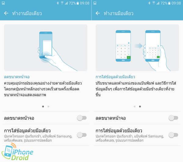 Samsung Galaxy J7 Prime มีหน้าจอแสดงผลที่มีขนาดใหญ่ จึงมีฟีเจอร์สำหรับการใช้งานมือเดียวมาให้ด้วย ซึ่งจะปรับขนาดและตำแหน่งของหน้าต่างแอพที่รองรับฟีเจอร์นี้ให้มีขนาดเล็กลง สามารถขยับหน้าต่างไปทางขอบด้านซ้ายหรือขวาก็ได้ ได้แก่ ปุ่มเมนูโทร, แป้นพิมพ์ Samsung, เครื่องคิดเลข และรูปแบบการปลดล็อค