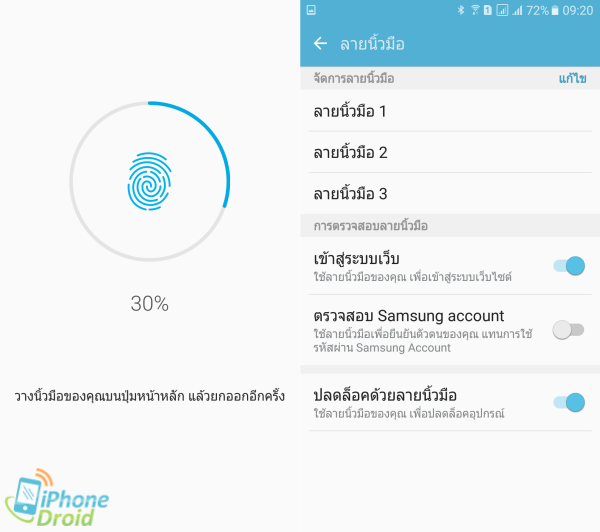 ระบบสแกนลายนิ้วมือรองรับการจดจำได้สูงสุด 3 ลายนิ้วมือ สามารถใช้ปลดล็อคหน้าจอ, ล็อกอินเข้าสู่เว็บไซต์ และยืนยันบัญชี Samsung ได้