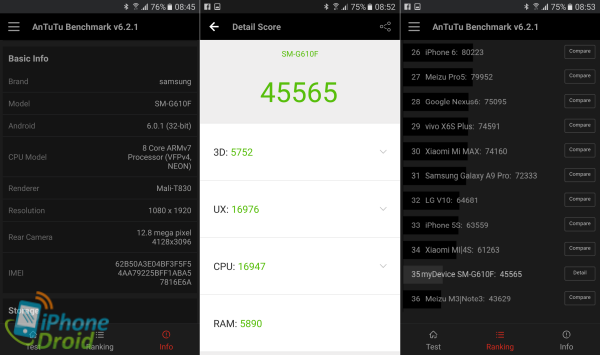 ผลการทดสอบ AnTuTu V6.2.1 เป็นการทดสอบการเข้าถึงการทำงานของแรม (RAM) และประสิทธิภาพการทำงานของหน่วยประมวลผลกราฟิกหรือจีพียู (GPU) ทำคะแนนรวมได้ 45,565 คะแนน