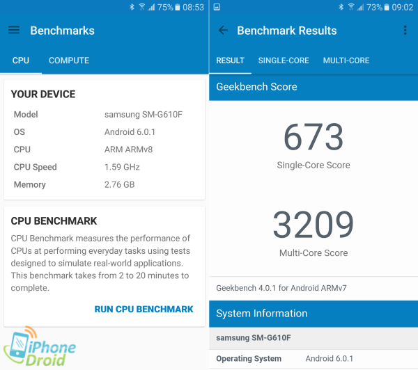 ผลการทดสอบด้วย Geekbench 4 เพื่อทดสอบประสิทธิภาพการทำงานและการประมวลผลและหน่วยความจำแรม การทดสอบนี้จะทำการประมวลออกมาเป็นตัวเลขแบ่งออกเป็น 2 แบบคือ Single-Core และ Multi-Core หากได้คะแนนยิ่งสูงประสิทธิภาพการทำงานจะยิ่งดี โดยผลทดสอบของ Galaxy J7 Prime ทำคะแนน Single-Core ได้ 673 และ Multi-Core ทำได้ 3,209 คะแนน