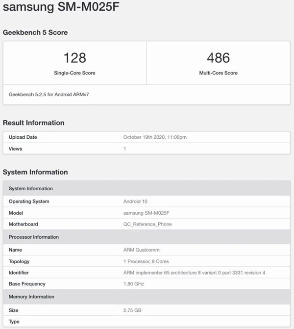 อ้างอิงจาก Geekbench ระบุว่า Galaxy M02 โมเดล SM-M025F ได้รันบนระบบปฏิบัติการ Android 10 พร้อมคาดว่าจะครอบทับด้วย One UI 2.0 ใช้หน่วยประมวลผลจาก Qualcomm ที่น่าจะใช้เป็นชิป Snapdragon 450, RAM 3GB และมี ROM ขั้นต่ำ 32GB สามารถเพิ่ม MicroSD Card ได้