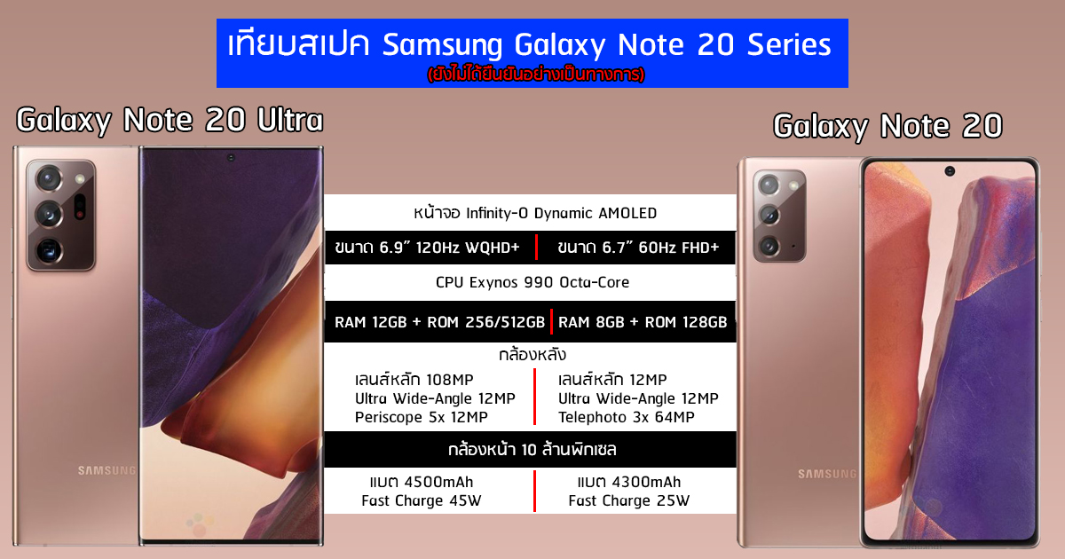 ในวันนี้ Samsung ประเทศไทยได้เปิดให้พรีออเดอร์ Galaxy Note 20 Series เป็นเจ้าของ New Galaxy กลุ่มแรกของโลก! ผ่านทาง : https://bit.ly/30yMNU9 ใครที่ชั่งใจว่าจะจองดีหรือไม่ เรามีสเปคที่หลุดทั้งหมดของ Note 20 และ Note 20 Ultra มาให้เทียบกันครับ