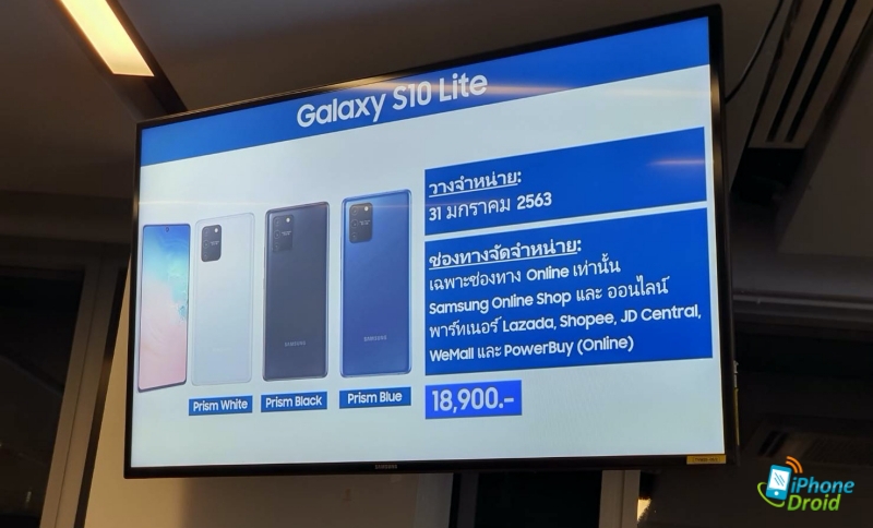 สำหรับGalaxy S10 Lite มีทั้งหมด 3 สี ได้แก่ Prism White Prism Black และ Prism Blue ในราคา 18,900 บาท พร้อมวางจำหน่ายอย่างเป็นทางการทั่วประเทศตั้งแต่วันที่ 31 มกราคม 2563 เป็นต้นไป ผ่านทางซัมซุง ออนไลน์ ชอป https://shop.samsung.com/th/ และ ซัมซุง ออฟฟิเชียล สโตร์ ใน ลาซาด้า, ช้อปปี้, เจดี เซ็นทรัล และ วีมอลล์ สามารถติดตามรายละเอียดเพิ่มเติมเกี่ยวกับผลิตภัณฑ์ได้ที่เว็ปไซต์ www.samsung.com/th/galaxy-s10lite