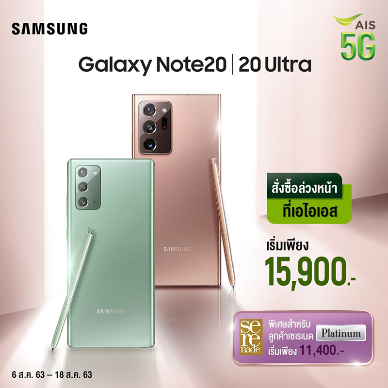 มาต่อที่โปรโมชั่นของเครือข่ายกันครับ เริ่มด้วย AIS ที่ให้เริ่มจอง Samsung Galaxy Note20 Series ที่มีส่วนลดสูงสุดถึง 18,500 บาท (สำหรับลูกค้า Serenade Platinum รายเดือน และอายุการใช้งาน 1 ปีขึ้นไป) พร้อมสิทธิพิเศษดู YouTube Premium โดย Note20 เริ่มต้นเพียง 11,400 บาท และ Note20 Ultra เริ่มต้นเพียง 20,400 บาท