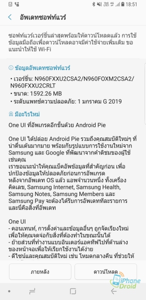 หลังจากที่ก่อนหน้านี้ Samsung ประเทศไทยได้ปล่อยตารางอัปเดท Android 9.0 ให้กับรุ่นต่างๆ ของทาง Samsung (รายละเอียดการอัปเดทแต่ละรุ่นคลิก) ล่าสุด Galaxy Note9 ในประเทศไทยได้รับการอัปเดท Android Pie 9.0 เป็นที่เรียบร้อยแล้วครับ
