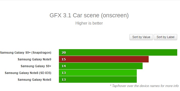 จากผลการทดสอบด้านกราฟฟิกพบว่า Samsung Galaxy Note9 มีคะแนนที่ดีกว่า Samsung Galaxy Note8 ถึง 25% แต่ในขณะเดียวกันเมื่อเทียบกับ Samsung Galaxy S9+ ที่ใช้ชิปเซ็ต Snapdragon 845 ในการขับเคลื่อนนั้นกับทำได้ดีกว่า Samsung Galaxy Note9 ที่ใช้ Exynos 9810 ถึง 6% เลยทีเดียว