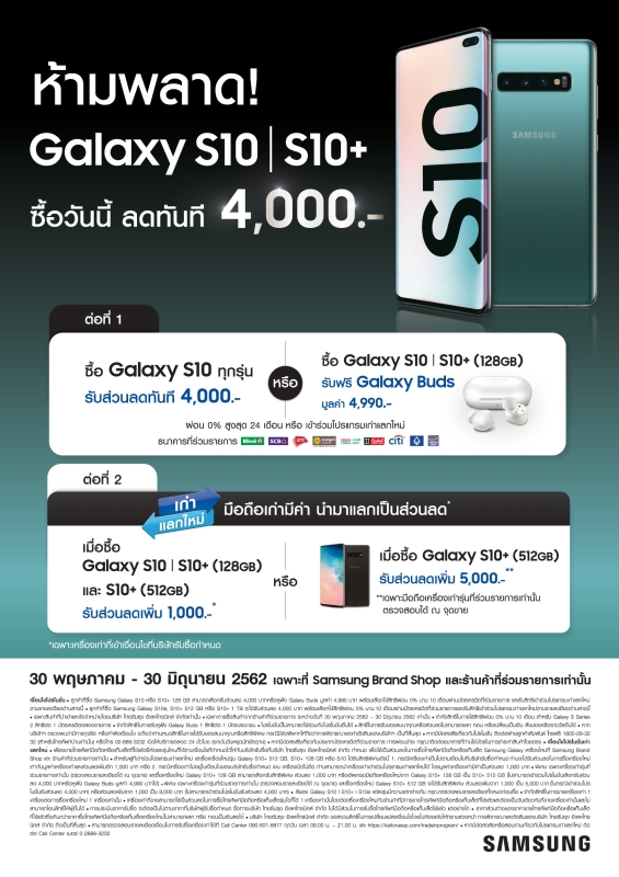 โดยครั้งนี้ ซัมซุงได้ส่งโปรโมชั่นแรง รับส่วนลดสุดพิเศษถึง 2 ต่อ ต่อที่ 1 เมื่อซื้อ ซัมซุง กาแลคซี่ เอส 10 ทุกรุ่น รับส่วนลดทันที 4,000 บาท หรือเลือกรับฟรี หูฟังไร้สาย กาแลคซี่ บัดส์ มูลค่า 4,990 บาท สำหรับลูกค้าที่ซื้อ ซัมซุง กาแลคซี่ เอส 10 และ เอส 10 พลัส ความจุ 128 GB พร้อมรับสิทธิ์ผ่อน0% นานสูงสุด 24 เดือนผ่านบัตรเครดิตที่ร่วมรายการ