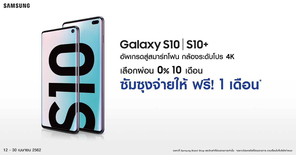 สำหรับลูกค้าที่ซื้อ Galaxy S10+ 128GB จากร้านค้าที่ร่วมรายการ และเว็บไซต์ https://shop.samsung.com/th ระหว่างวันที่ 12-30 เมษายน 2562 สามารถใช้สิทธิ์ผ่อน 0% นาน 10 เดือนผ่านบัตรเครดิตที่ร่วมรายการเพื่อรับส่วนลด โดยรุ่น S10+ 128GB วางจำหน่ายในราคา 35,900 บาท แล้วเลือกผ่อน 0% นาน 10 เดือนๆ ละ 3,590 บาท ซึ่งก็จะได้รับส่วนลด 3,590 บาท เท่ากับ Samsung จ่ายให้ 1 เดือนนั่นเอง