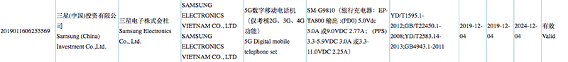สำหรับ Galaxy S11e 5G ในโมเดล SM-G9810 ที่รองรับ 5G ได้ผ่านการรับรองรัจาก 3C เป็นที่เรียบร้อย ซึ่งระบุว่าจะรองรับ Fast Charge 25W เพิ่มขึ้นจาก S10e ที่รองรับเพียง 15W เท่านั้น