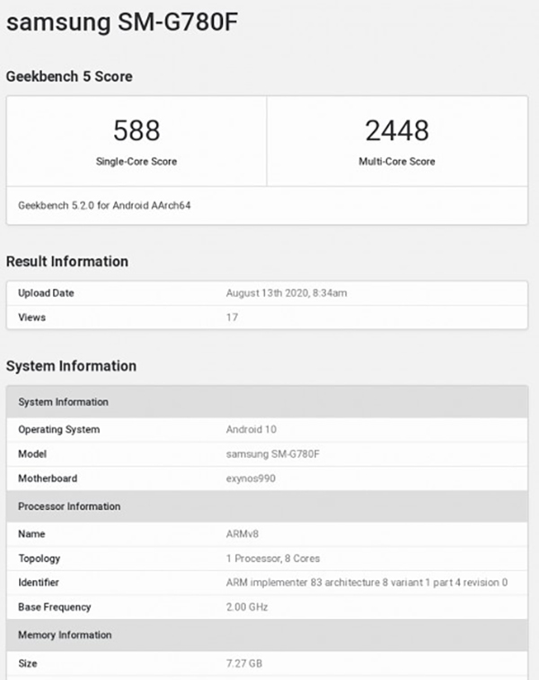 Galaxy S20 Fan Edition โมเดล SM-G780F นั้นทดสอบด้วยชิป Exynos 990 ควบคู่กับ RAM 8GB พร้อมระบบปฏิบัติการ Android 10