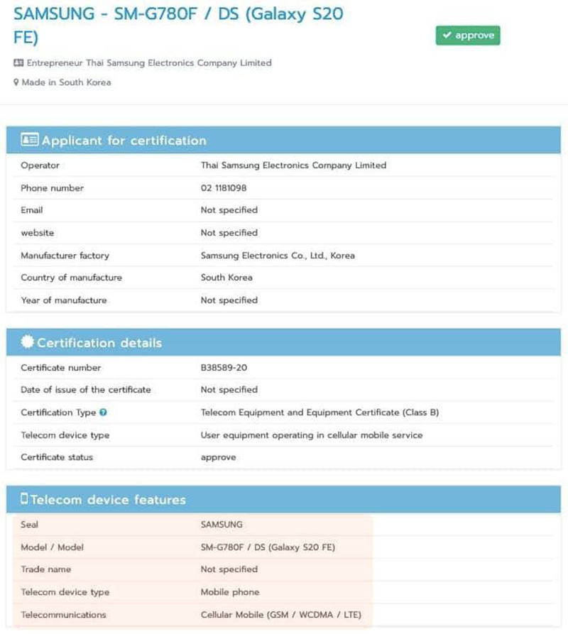 Samsung Galaxy S20 FE ผ่านการรับรอง กสทช. ของประเทศไทยแล้ว