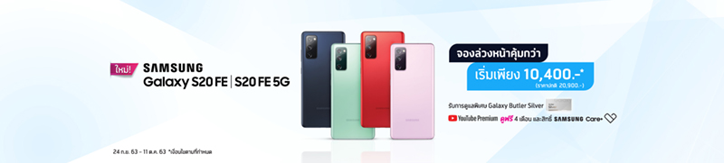 และสุดท้ายกับ DTAC สามารถสั่งซื้อ Samsung Galaxy S20 FE Series ล่วงหน้า ที่เริ่มต้นเพียง 10,400 บาท พร้อมสมัครแพ็กเกจรายเดือน ตั้งแต่วันที่ 24 ก.ย. เวลา 10.00 น. – 11 ต.ค. 63 เวลา 24.00 น.