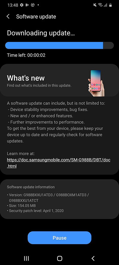 Samsung ได้เริ่มปล่อยอัปเดทเฟิร์มแวร์ G98xBXXU1ATD3 ให้กับ Galaxy S20 Series ทุกรุ่น โดยแก้ไขปัญหาจอเขียวและปัญหาเล็กน้อยอื่นๆ