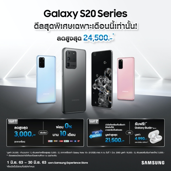 - ความพิเศษต่อที่ 1 เมื่อซื้อ Galaxy S20 series รับทันทีส่วนลดสูงสุด 3,000 บาท หรือเลือกรับผ่อน 0% นาน 10 เดือน พร้อมรับเงินคืน 3% (เฉพาะธนาคารที่ร่วมรายการ)