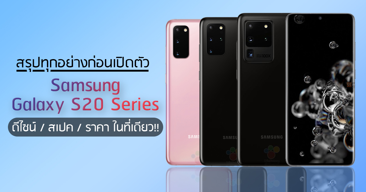 ใกล้ที่จะเปิดตัวอย่างเป็นทางการแล้วสำหรับ Samsung Galaxy S20 Series ในวันที่ 12 กุมภาพันธ์ เวลา 02.00 น. ตามเวลาในประเทศไทย ซึ่งตอนนี้ก็มีข่าวลือมากมายเต็มไปหมด วันนี้เราจะมาสรุปทุกประเด็นให้ในที่เดียว! ทั้งดีไซน์ สเปค และราคา