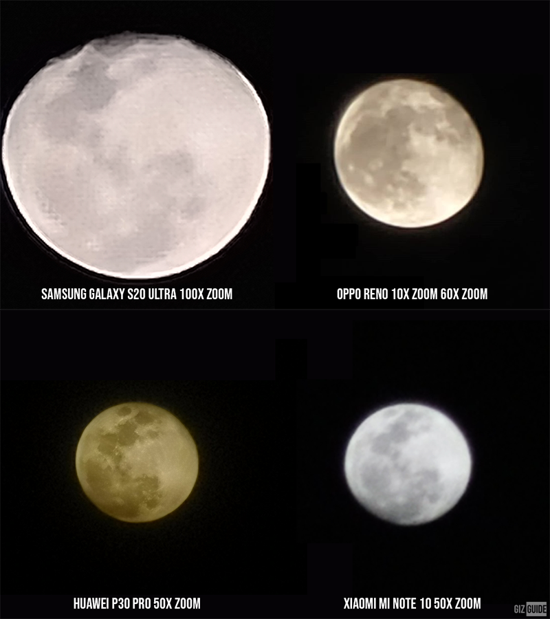 จากภาพที่เห็น Galaxy S20 Ultra นั้นถ่ายดวงจันทร์ได้ใกล้สุดๆ โดยไม่มีการปรับแต่งจาก AI ใดๆ ทั้งสิ้น และเมื่อนำไปเทียบกับรุ่นอื่นๆ ทั้ง OPPO Reno 10x ZOOM ที่ 60x, HUAWEI P30 Pro ที่ 50x และ Xiaomi Mi Note 10 ที่ 50x ทาง Galaxy S20 Ultra นั้นถ่ายได้ใกล้ที่สุดครับ อย่างไรก็ตาม เว็บไซต์ GizGuide ระบุด้วยว่า Samsung อาจปล่อยอัปเดทเพิ่มเติมหลังจากที่วางขายเพื่อให้การถ่ายภาพนั้นดียิ่งขึ้นด้วย