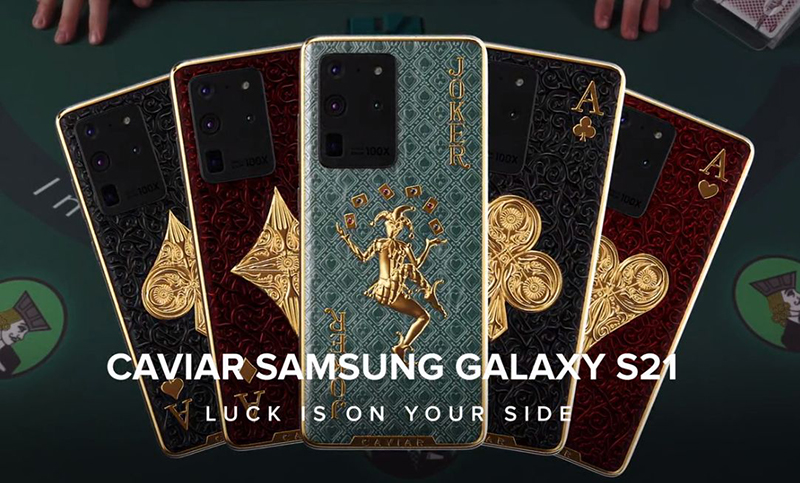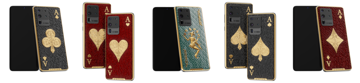Caviar ผลิต Samsung Galaxy S20 Ultra เคลือบทองคำที่มีลวดลายของไพ่ประดับอยู่หลังเครื่อง ซึ่งตอนนนี้ก็มีให้เลือกอยู่ 5 แบบ ได้แก่ หัวใจ (โพธิ์แดง), ข้าวหลามตัด, ดอกจิก, โพธิ์ดำ และ Joker ซึ่งแต่แบบจะมีให้แบบจำกัดที่ 21 เครื่องเท่านั้นครับ ซึ่งเป็นตัวเลขในการชนะ Blackjack นั่นเอง
