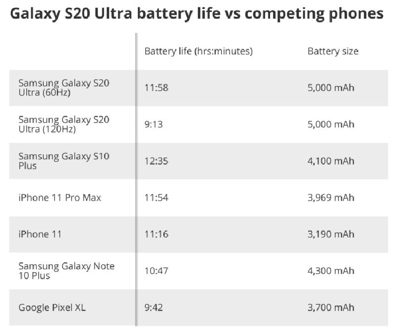 เว็บไซต์ Tom’s Guide ได้ทดสอบ Galaxy S20 Ultra เปิดจอ 60Hz พร้อมชาร์จเต็ม 100% และใช้งาน 5G ไปด้วย โดยใช้งานได้ทั้งสิ้น 11 ชั่วโมง 58 นาที (หากใช้ 4G อาจอยู่ได้นานกว่านี้ครับ) ทั้งนี้ เมื่อลองเปิดหน้าจอแบบ 120Hz การใช้งานนั้นลดลงไปเกือบ 3 ชั่วโมง อยู่ที่ 9 ชั่วโมง 13 นาที