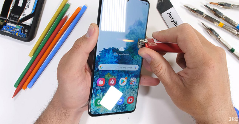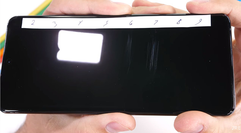 Galaxy S20 Ultra มาพร้อมกับกระจก Gorilla Glass 6 เพื่อป้องกันการกระแทกและรอยขูดขีดที่มากขึ้นกว่ารุ่นที่ 5 ครับ โดยเริ่มแรกได้ถูกทดสอบด้วยการขูดระดับต่างๆ ตามความคม โดยรุ่นนี้ก็มีรอยตั้งแต่ระดับ 6 ครับ ซึ่งเป็นเรื่องปกติของสมาร์ทโฟนทั่วไป แต่เหมือนว่ารอยนั้นจะน้อยลงมากกว่ารุ่นที่ใช้กระจก Glass 5