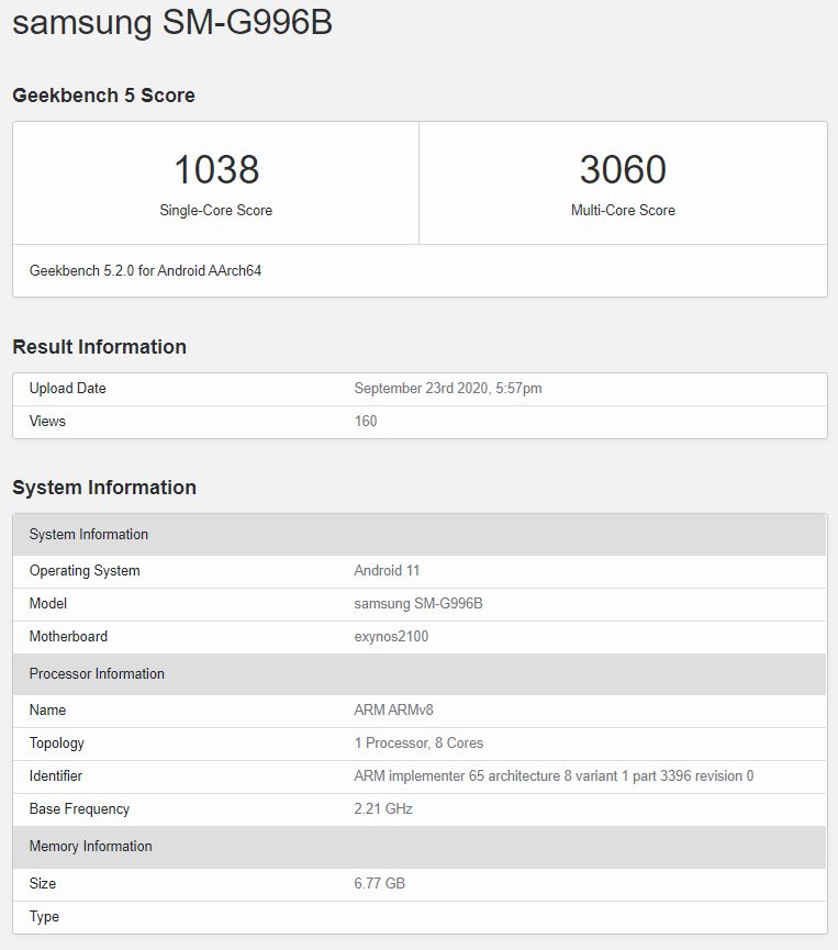 ในการทดสอบเราจะเห็น Galaxy S21 ใช้ Exynos 2100 ครับ แต่ในตอนเปิดตัวปีหน้าอาจจะใช้ชื่อ Exynos 1000 ตามข่าวลือก่อนหน้านี้ ซึ่งคะแนนที่ได้จะเป็น Simgle-core ที่ 1,038 และ Multi-core ที่ 3,060 ทั้งยังมาพร้อม RAM 8GB และรันบน Android 11