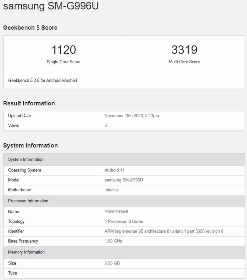 การทดสอบปรากฏบน Geekbench ในโมเดลรุ่น SM-G996U ที่เป็นชิพ Snapdragon 875 + RAM 8GB โดยทำคะแนน Single-core ไปที่ 1,120 และ Multi-core ที่ 3,319 มากกว่า Exynos 2100 ที่ทำได้ 1,038 และ 3,060 ตามลำดับ