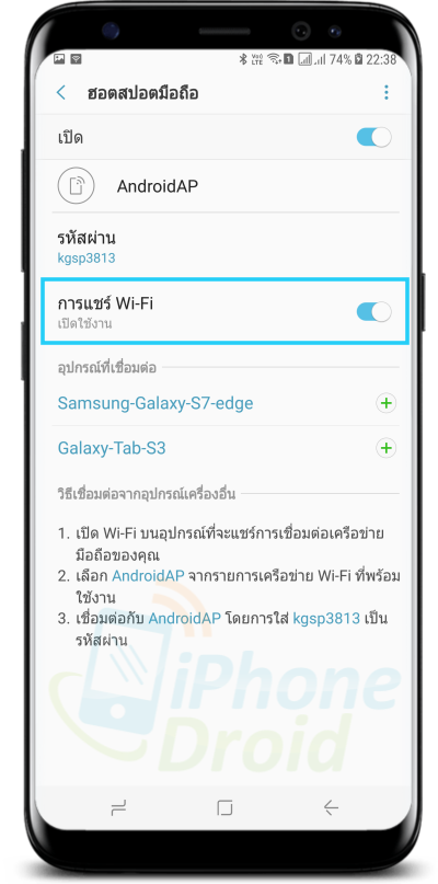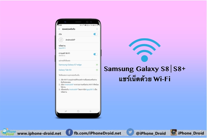 เพียงเท่านี้เราก็สามารถแชร์ Wi-Fi ให้กับเครื่องอื่น ๆ ได้แล้ว โดยไม่ต้องบอกรหัสผ่านของ Wi-Fi หลักส่วนตัวของเรา เพราะชื่อและรหัสผ่าน Wi-Fi ที่เราแชร์ต่อนั้นเป็นของเครื่อง Galaxy S8 นั่นเอง