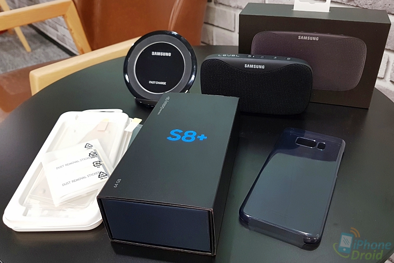 Samsung Galaxy S8 l S8+ มาในกล่องสีดำเรียบ ๆ แต่ดูหรู มีชื่อรุ่นระบุอยู่หน้ากล่อง และมีอุปกรณ์เสริมต่าง ๆ อยู่ในกล่องด้วย ได้แก่