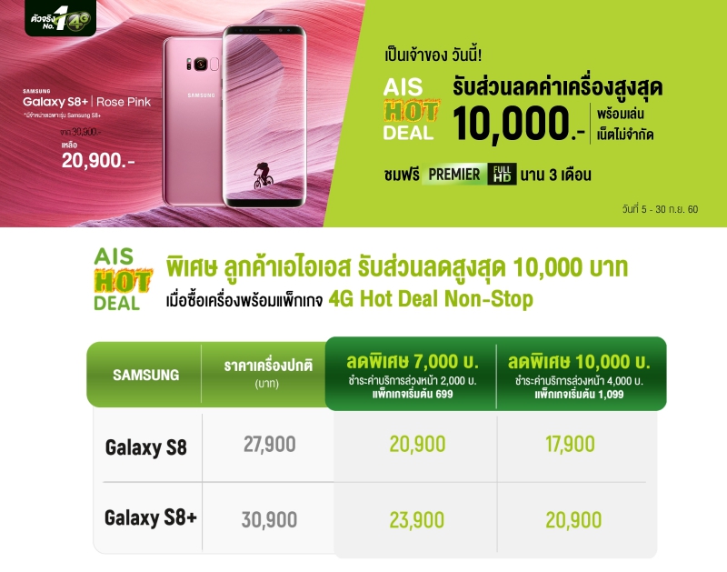 AIS ลดค่าเครื่อง Galaxy S8 สูงสุด 10,000 บาทเช่นเดียวกัน เหลือเพียง 17,900 (จากราคาปกติ 27,900 บาท) และ Galaxy S8+ เพียง 20,900 บาท (จากราคาปกติ 30,900 บาท) สำหรับลูกค้าเปิดเบอร์ใหม่ ย้ายค่ายเบอร์เดิม เปลี่ยนจากเติมเงินเป็นรายเดือน และลูกค้าปัจจุบันในระบบรายเดือน เมื่อซื้อเครื่องพร้อมแพ็กเกจ 1,099 ขึ้นไป พร้อมชำระค่าบริการล่วงหน้า 4,000 บาท โดยค่าบริการล่วงหน้าตามที่ชำระ จะถูกแบ่งหัก เป็นส่วนลดค่าบริการรายเดือน 10 เดือน เริ่มมีผลรอบบิลที่ 2 เป็นต้นไป