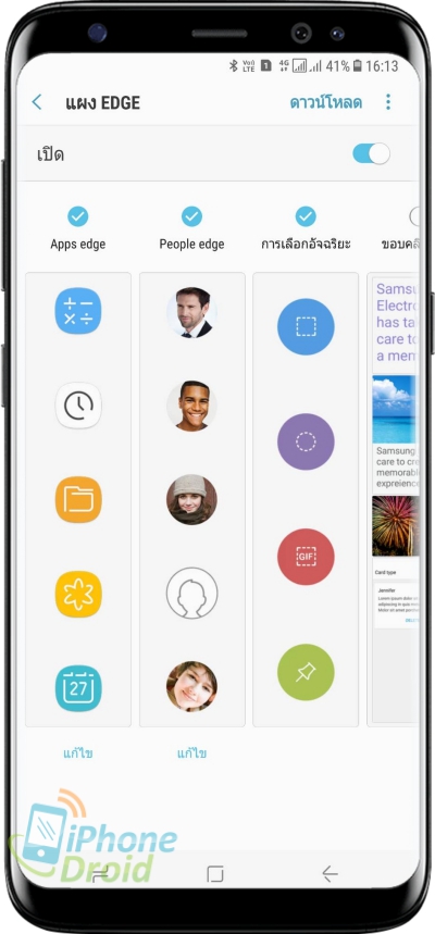 - เข้าไปที่เมนู การตั้งค่า (Settings) > จอภาพ (Display) > หน้าจอขอบ (Edge Screen) > แผง Edge (Edge Panels)