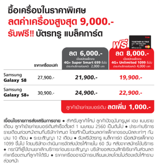 สิทธิพิเศษสำหรับลูกค้าทรู แบล็คการ์ด รับส่วนลดค่าเครื่องสูงสุด 50% ราคาเริ่มต้นเพียง 13,950 บาท เพียงเปิดเบอร์ใหม่หรือย้ายค่ายเบอร์เดิม สมัครแพ็กเกจ 4G+ Unlimited 1099 ขึ้นไป เล่นเน็ต 4G+ Unlimited ไม่อั้น ไม่ลดสปีด และชำระค่าบริการรายเดือนล่วงหน้า 5,000 บาท ระยะเวลาการใช้งานนาน 24 เดือน