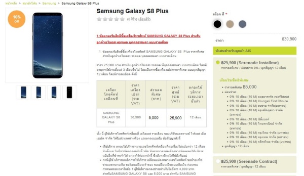 ดีล ดีดี พิเศษ สำหรับลูกค้า Serenade ซื้อ Samsung Galaxy S8+ ลดทันที 5,000 เหลือเพียง 25,900 บาท พร้อมสิทธิ์ ผ่อน 0% (installment) โดยไม่ต้องเปลี่ยนแพ็เกจ (สัญญาการใช้งาน 12 เดือน)
