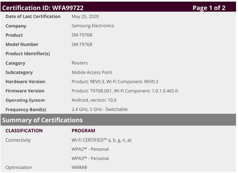 โมเดลรุ่น SM-T976B ที่คาดการณ์ว่าจะเป็น Tab S7+ 5G ได้ผ่านการรับรอง Wi-Fi ซึ่งโมเดล SM-T970 (Wi-Fi) และ SM-T975 (4G) ก็ผ่านแล้วเช่นกัน ทั้งนี้ ในรุ่น 5G ที่เคยมีใน Tab S6 วางขายแค่ที่เกาหลีใต้ ซึ่ง Tab S7+ 5G น่าจะขยายตลาดไปทางฝั่งยุโรปด้วย
