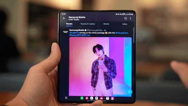 อีกหนึ่งความสามารถของ Galaxy Z Fold ที่ทำได้ดีขึ้นเรื่อย ๆ ในทุกรุ่นก็คือ Flex mode หรือการทำงานร่วมกับการพับหน้าจอ อย่างที่ทราบกันดีว่า Galaxy Z Fold4 นั้นสามารถปรับระดับของหน้าจอได้หลากหลายไม่ใช่แค่พับกับกางเท่านั้น เพราะฉะนั้นหากเรากางจอออกสักครึ่งหนึ่งก็คงเหมาะที่จะใช้ส่วนหนึ่งของตัวเครื่องเป็นขาตั้งไว้ใช้งานด้วย อาทิ เราเปิด YouTube แล้วพับจอเข้าหากัน หน้าจอบนจะเป็นวิดีโอส่วนจอล่างก็จะเป็นส่วนของ Desciption หรือคอมเมนต์ให้เราอ่านไปพร้อม ๆ กันได้