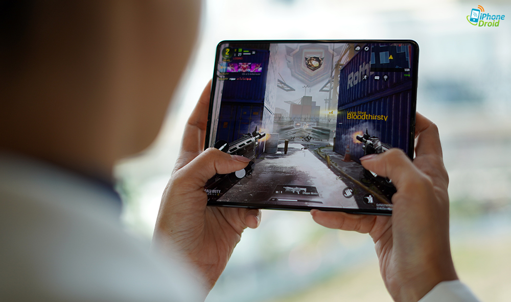 อย่างที่เห็นไปว่าอัตราส่วนหน้าจอของ Z Fold4 ทั้งนอกและในไม่มาตรฐานเลย ทำให้ในการเล่นเกมถ้าไม่ยาวเกินไปก็จัตุรัสเกินไป แต่ใช่ว่า Samsung จะไม่เข้าใจปัญหานี้ เพราะเขาก็มีทางเลือกสำหรับสายเกมที่ต้องการเล่นได้แบบสเกลปกติ ด้วยฟีเจอร์การปรับสเกลของแต่ละแอปได้เอง อย่างในที่นี้เราเลิกสเกล 16:9 ให้เกม Call of Duty เพื่อที่จะได้เล่นบนหน้าจอในแบบถนัดขึ้น ผลก็ออกมาอย่างที่เห็นครับ เล่นได้ง่ายขึ้นแถมรอบนี้การปรับสเกลยังสามารถเลื่อนหน้าจอไว้ส่วนบน-ตรงกลางจอ-ส่วนล่างได้ด้วย ทำให้การแตะกดปุ่มในเกมนั้นสะดวกขึ้น